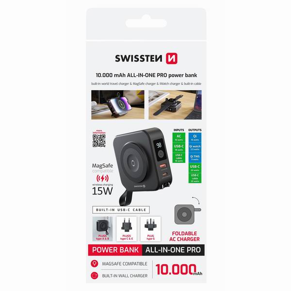 SWISSTEN, Powerbank, ALL-IN-ONE PRO, Li-Pol, 5/9/12V, do ładowania telefonów i innych urządzeń, 22013978, 10000mAh, kabel USB-C, 1