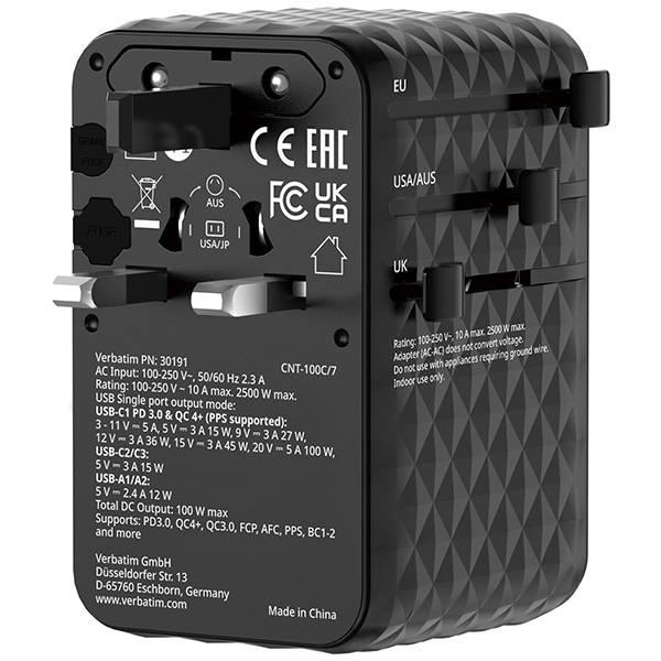 Obudowa o nowoczesnym designie 3D w kolorze czarnym wykonana jest z ognioodpornego poliwęglanu klasy premium, co zapewnia wytrzymałość i bezpieczeństwo. Adapter posiada certyfikaty CE, UKCA, FCC i ROHS oraz bezpiecznik BS1362 10A (w zestawie zapasowy) i praktyczne etui podróżne.