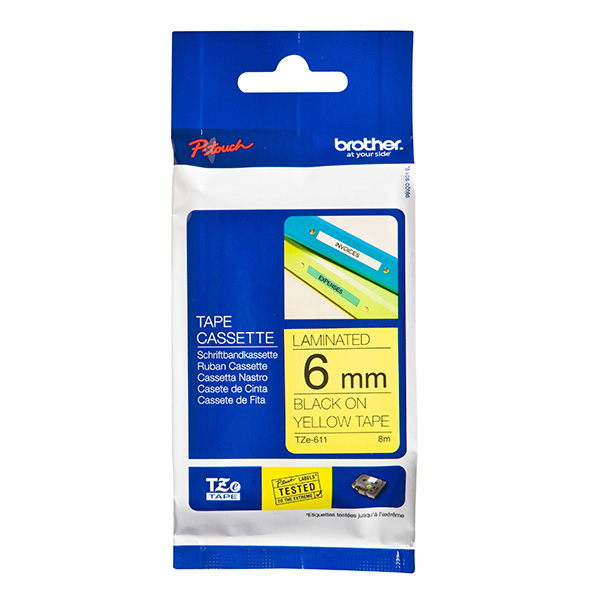 Brother oryginalny taśma do drukarek etykiet, Brother, TZE-611, czarny druk/żółty podkład, laminowane, 8m, 6mm