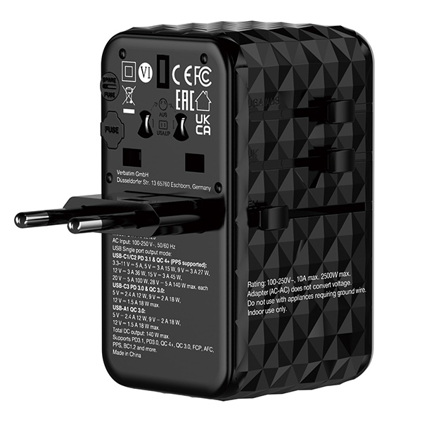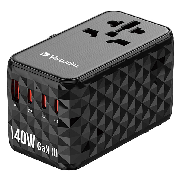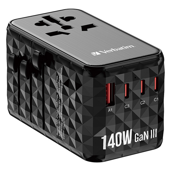 Verbatim, Uniwersalny adapter podróżny 2x USB-C PD i QC 4+, 1x USB-C PD 3.0, 1x USB-A QC, czarny, 140 W, uszkodzone opakowanie B,